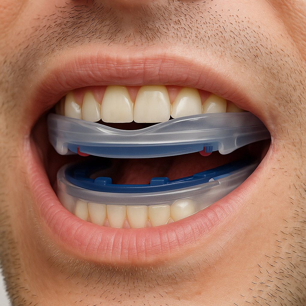 Die SchnarchKlammer hält den Unterkiefer leicht vorne – so bleibt der Atemweg frei und Schnarchen wird reduziert.